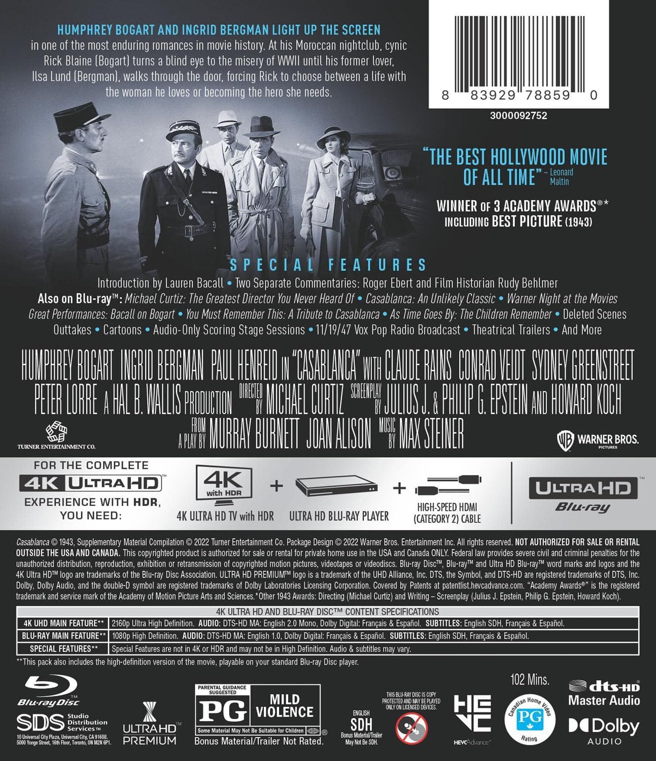 During WWII, Rick, a nightclub owner in Casablanca, agrees to help his former lover Ilsa and her husband. Soon, Ilsa’s feelings for Rick resurface and she finds herself renewing her love for him. Casablanca 4K Ultra HD + Blu-ray