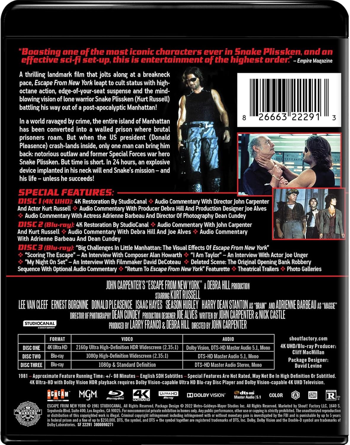 Gruff Snake Plissken, an ex-soldier turned convict, is sent to Manhattan, now a maximum security prison, to rescue the stranded US President. Escape From New York Collector’s Edition 4K UHD