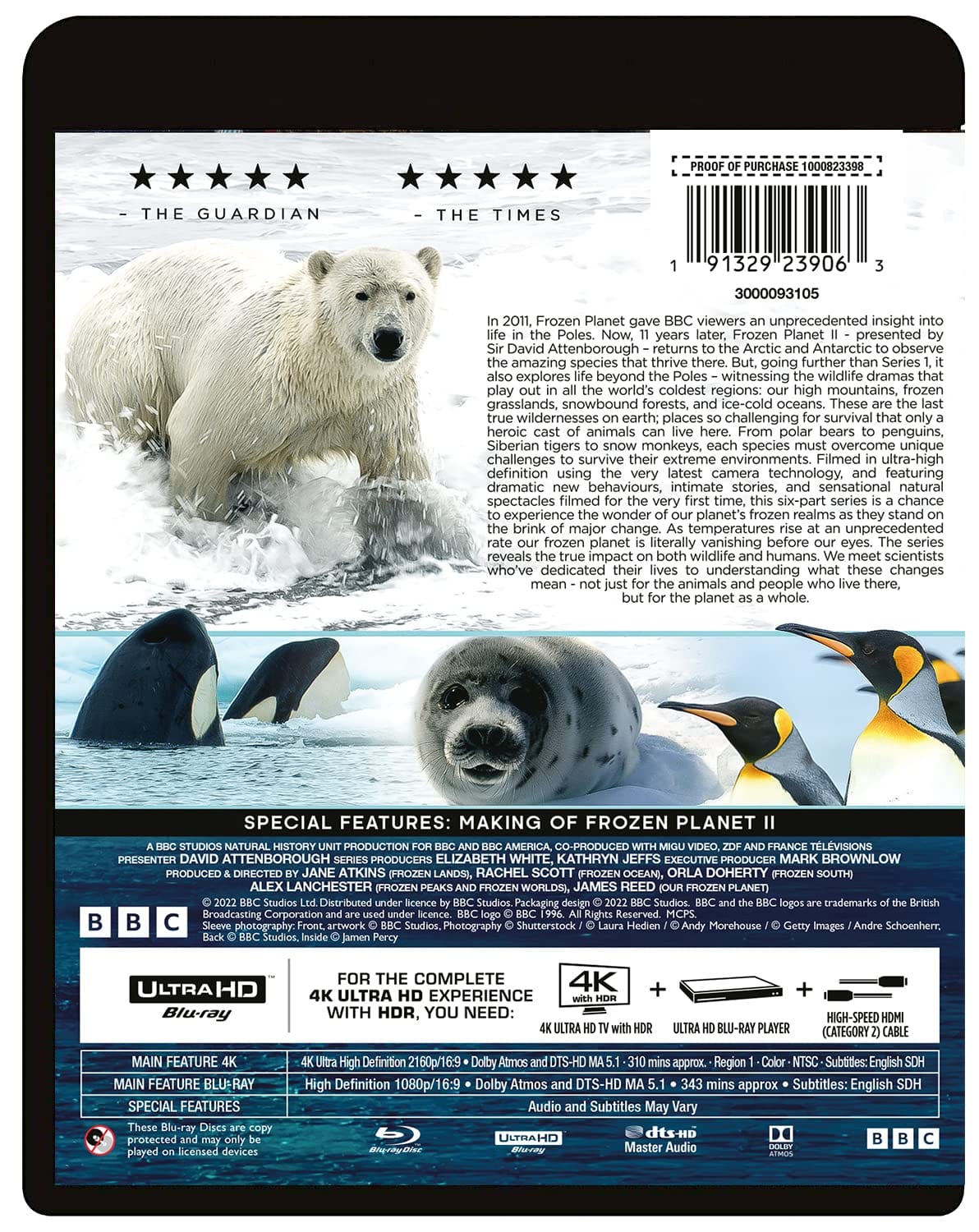 In 2011, Frozen Planet gave BBC viewers an unprecedented insight into life in the Poles.Now, 11 years later, Frozen Planet II – presented by Sir David Attenborough – returns to the Arctic and Antarctic to observe the amazing species that thrive there. But, going further than Series 1, it also explores life beyond the Poles – witnessing the wildlife dramas that play out in all the world’s coldest regions: our high mountains, frozen grasslands, snowbound forests, and ice-cold oceans.These are the last true wildernesses on earth; places so challenging for survival that only a heroic cast of animals can live here. From polar bears to penguins, Siberian tigers to snow monkeys, each species must overcome unique challenges to survive their extreme environments.”FROZEN PLANET II 4K Ultra HD Frozen Planet II 4K Ultra UHD/Blu-ray [4K UHD]