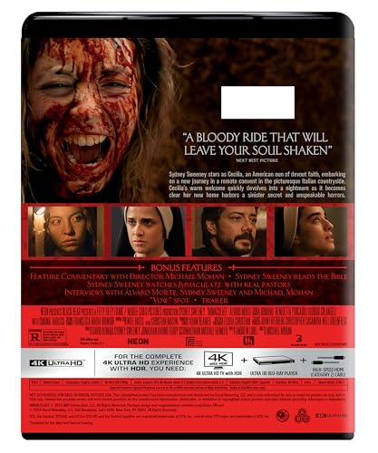 Sydney Sweeney (Anyone But You, Euphoria, The White Lotus) stars as Cecilia, an American nun of devout faith, embarking on a new journey in a remote convent in the picturesque Italian countryside. Cecilia’s warm welcome quickly devolves into a nightmare as it becomes clear her new home harbors a sinister secret and unspeakable horrors. Immaculate 4K UHD