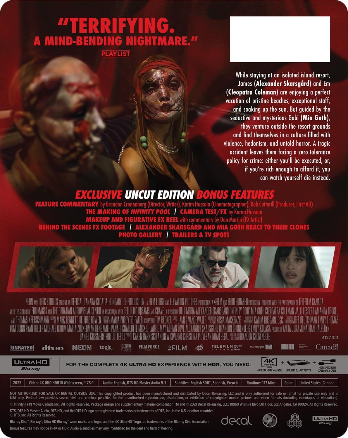 Guided by a seductive and mysterious woman, a couple on vacation venture outside the resort grounds and find themselves in a culture filled with violence, hedonism and untold horror. A tragic accident soon leaves them facing a zero tolerance policy for crime: either you’ll be executed, or, if you’re rich enough to afford it, you can watch yourself die instead. Infinity Pool Uncut Steelbook 4K UHD