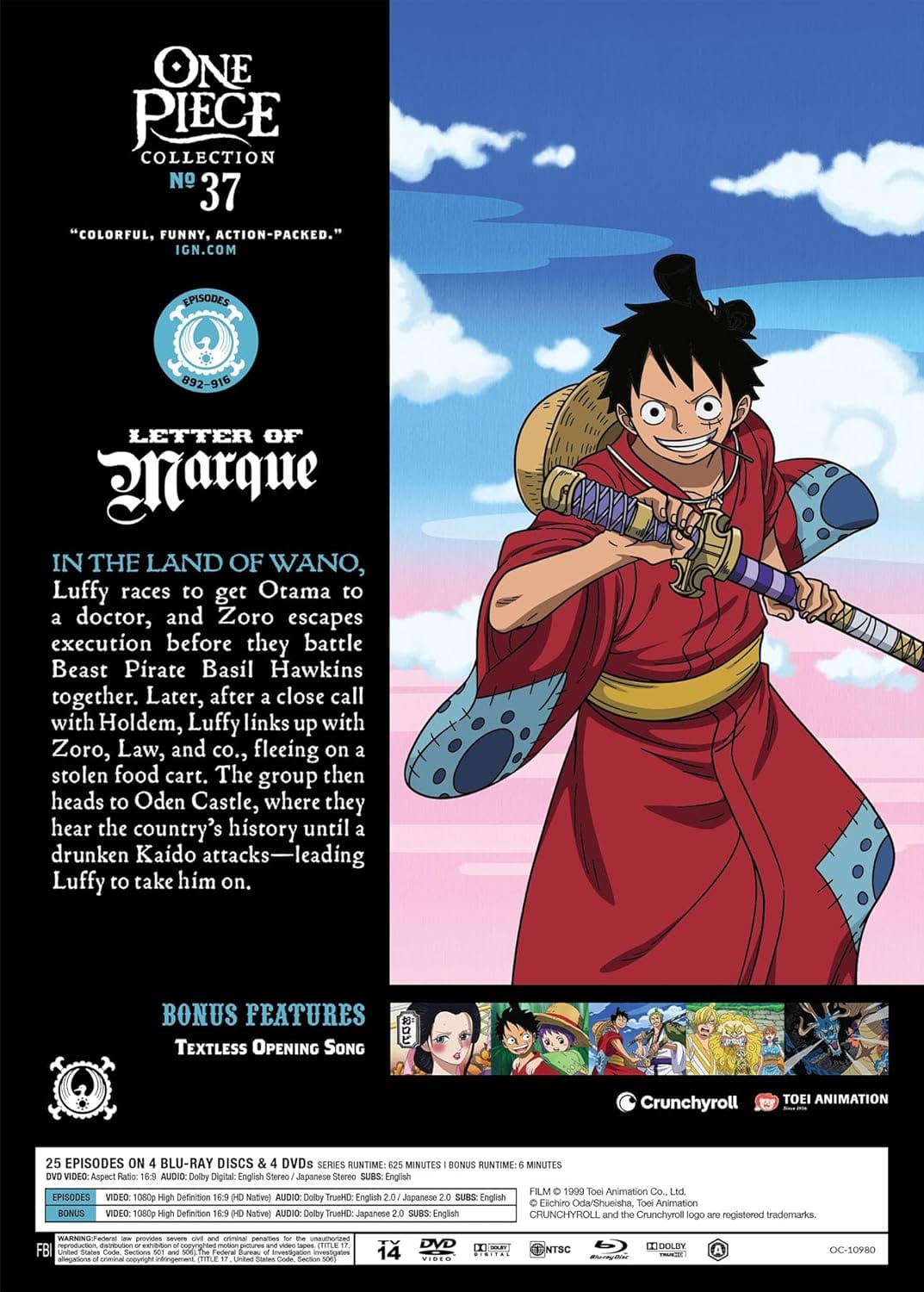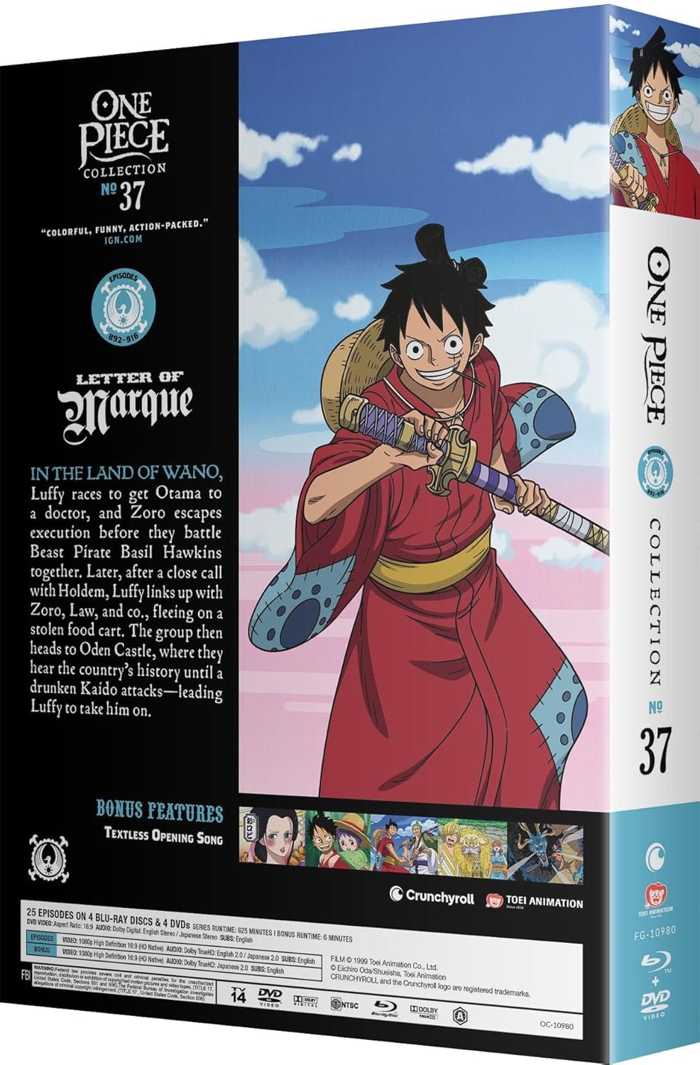 In the Land of Wano, Luffy races to get Otama to a doctor, and Zoro escapes execution before they battle Beast Pirate Basil Hawkins together. One Piece Collection 37 Blu-ray