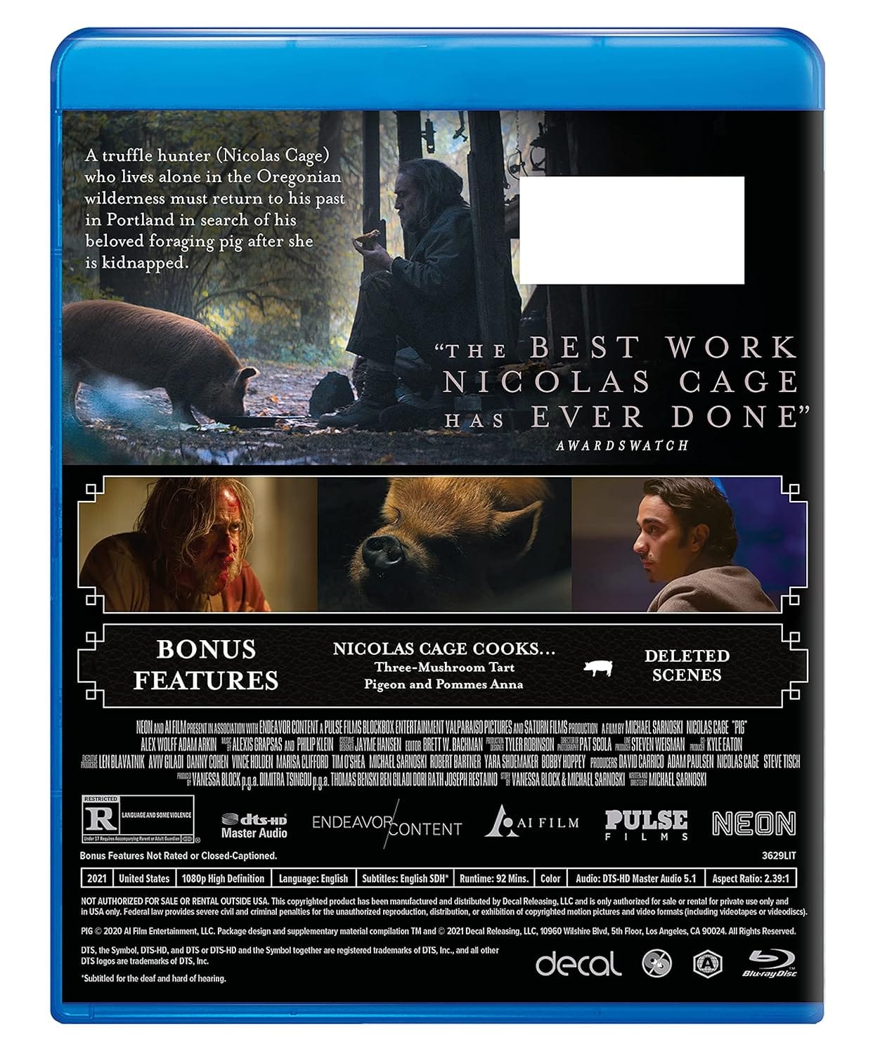 A truffle hunter (Nicolas Cage) who lives alone in the Oregonian wilderness must return to his past in Portland in search of his beloved foraging pig after she is kidnapped. Pig Blu-ray