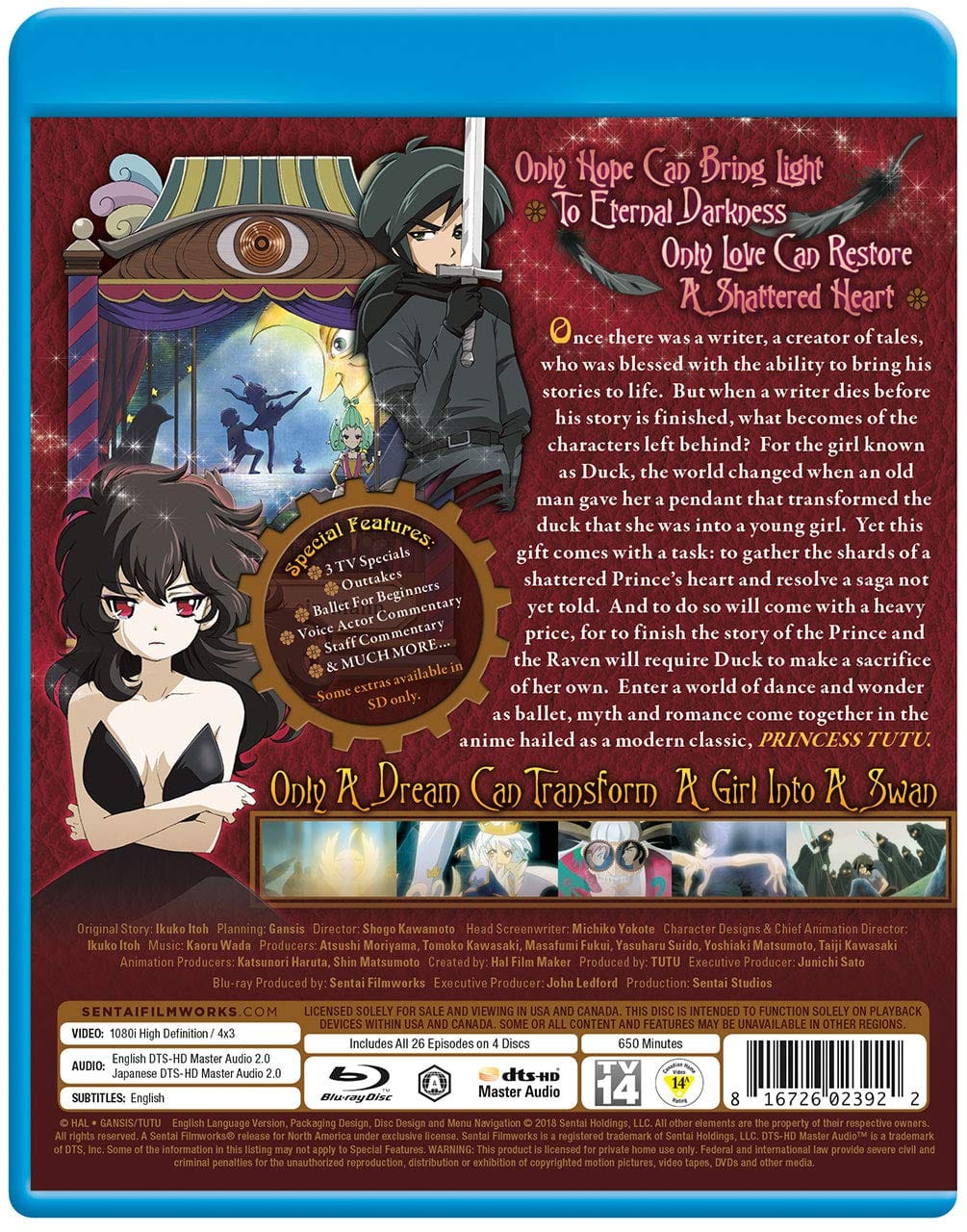 Princess Tutu Blu-ray – Once there was a writer, a creator of tales, who was blessed with the ability to bring his stories to life. But when the writer dies before his story is finished, what becomes of the characters left behind? For the girl known as Duck, the world changed when an old man gave her a pendant that transformed the duck that she was into a young girl. Now she must gather the shards of a shattered Prince’s heart and finish the story of the Prince and the Raven. But will that require Duck to make a sacrifice of her own? Enter a world of dance and wonder as ballet, myth and romance come together in the anime hailed as a modern classic. – Special Features: Voice Actor, Translator & Staff Commentaries; Outtakes; Etude; Ballet for Beginners; In the Studio; Japanese Pre-Production Promotional Video; Chapter of the Egg Suite; Mr. Cat’s Love Lesson; Vorfinale; The Path to Tutu; Clean Opening Animation; and Clean Closing Animation. – Princess Tutu contains anime episodes 1-26. PRINCESS TUTU COMPLETE COLLECTION