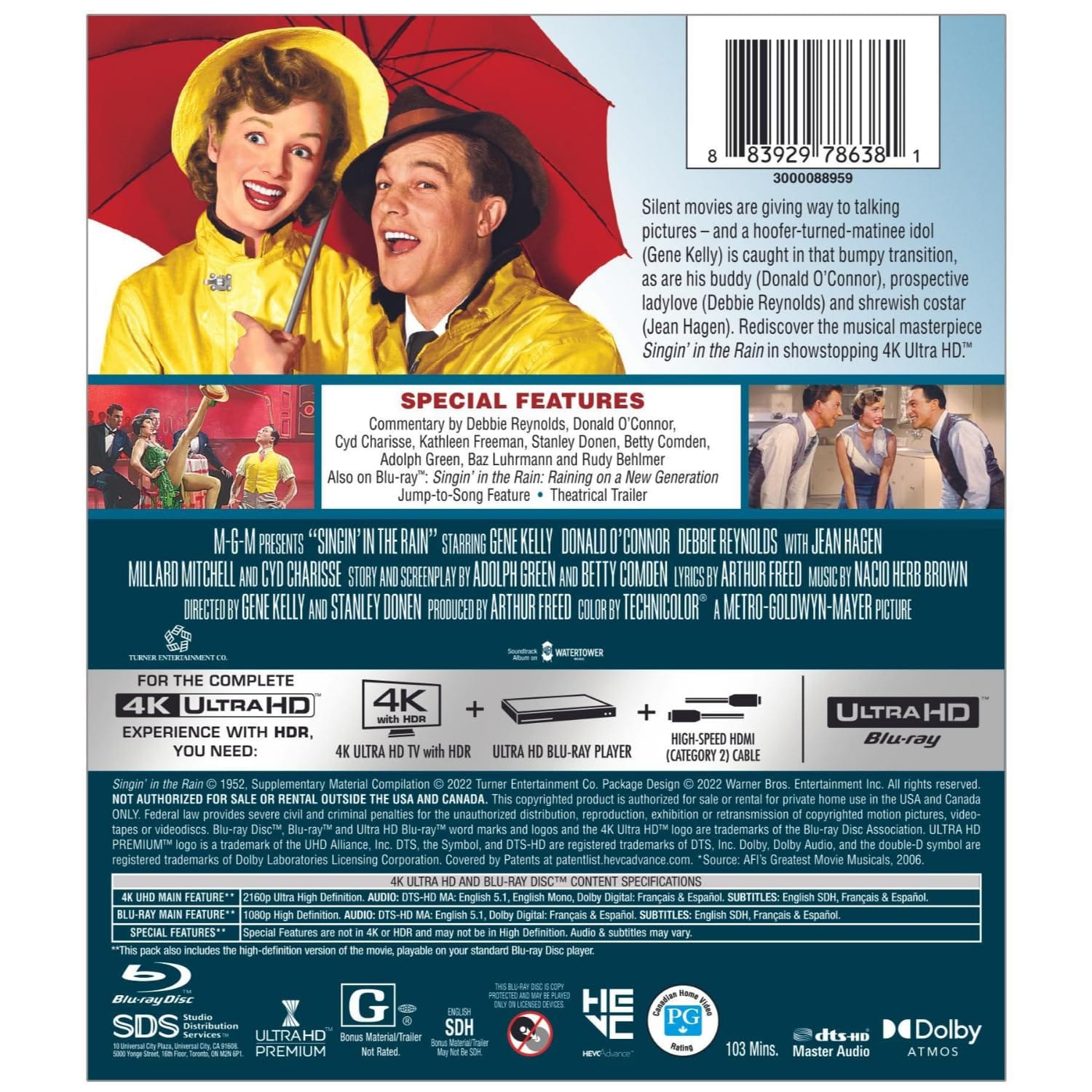 Gene Kelly, Debbie Reynolds and Donald O’Connor star in one of thegreatest musicals ever filmed. Musician Don Lockwood (Kelly) rises tostardom during Hollywood’s silent-movie era–paired with the beautiful ,jealous and dumb Lina Lamont (Jean Hagen). When Lockwood becomesattracted to young studio singer Kathy Selden (Reynolds), Lamont has herfired. But with the introduction of talking pictures, audiences laughwhen they hear Lockwood speak for the first time–and the studio usesSelden to dub her voice. Set during the advent of “talkies,” this film’sclassic song-and-dance numbers celebrate the beginning of moviemusicals. Singin’ in the Rain 4K UHD