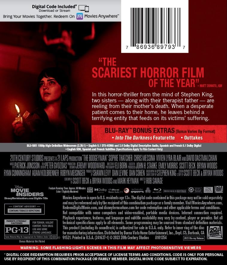 “The Boogeyman” is a horror-thriller from the mind of best-selling author Stephen King. High school student Sadie Harper and her younger sister Sawyer are reeling from the recent death of their mother and aren’t getting much support from their father, Will, a therapist who is dealing with his own pain. When a desperate patient unexpectedly shows up at their home seeking help, he leaves behind a terrifying supernatural entity that preys on families and feeds on the suffering of its victims. “The Boogeyman” stars Sophie Thatcher (“Yellowjackets”), Chris Messina (“Birds of Prey”), Vivien Lyra Blair (“Obi-Wan Kenobi”), Marin Ireland (“The Umbrella Academy”), Madison Hu (“Bizaardvark”), LisaGay Hamilton (“Vice”), and David Dastmalchian (“Dune”). Rob Savage directs from a screenplay by Scott Beck & Bryan Woods and Mark Heyman. Warning: Some flashing-lights scenes in this film may affect photosensitive viewers. The Boogeyman Blu-ray