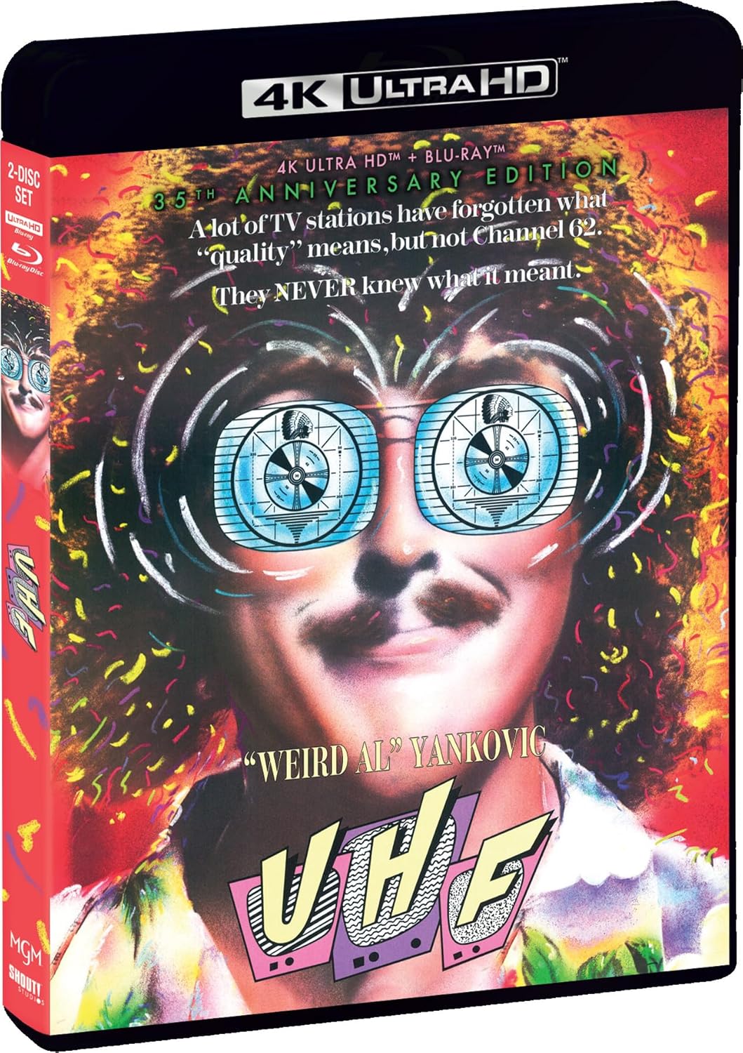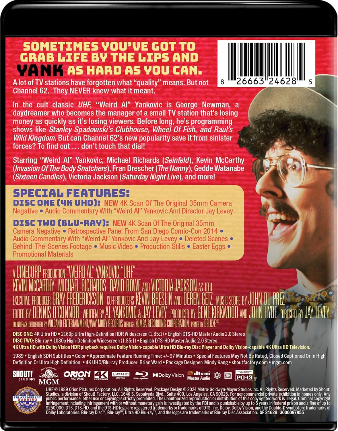 In the cult classic UHF, “Weird Al” Yankovic (Weird: The Al Yankovic Story) is George Newman, a daydreamer who becomes the manager of a small TV station that’s losing money as quickly as it’s losing viewers. Before long he’s programming shows like “Stanley Spadowski’s Clubhouse”, “Wheel Of Fish”, and “Raul’s Wild Kingdom.” But can Channel 62’s new popularity save it from sinister forces? To find out… don’t touch that dial! Starring “Weird Al” Yankovic, Michael Richards (Seinfeld), Kevin McCarthy (Invasion of the Body Snatchers), Fran Drescher (The Nanny), Gedde Watanabe (Sixteen Candles), Victoria Jackson (Saturday Night Live), and more! UHF 35th Anniversary Edition 4K Ultra HD + Blu-ray [4K UHD]