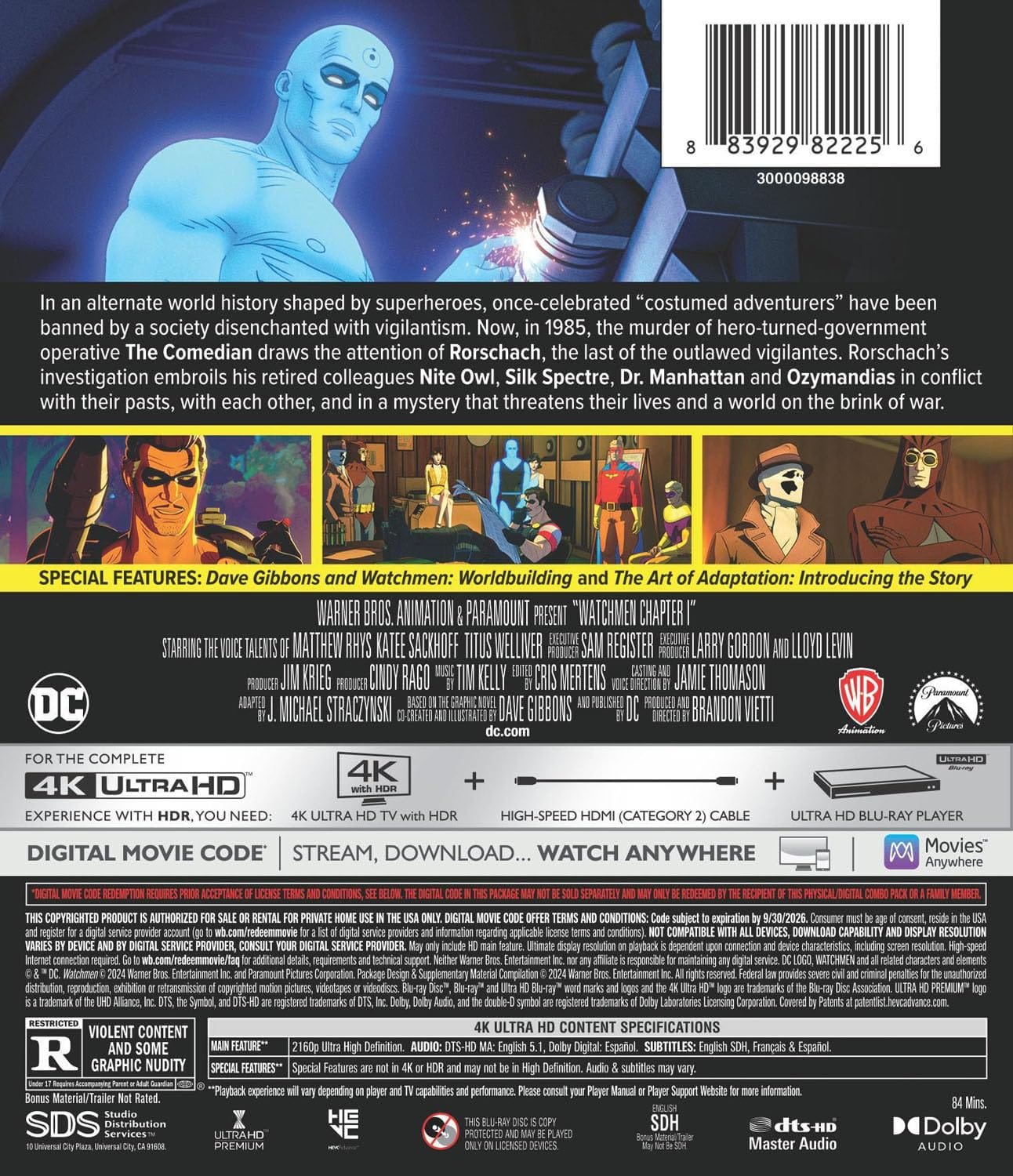 In an alternate world, the murder of a government sponsored superhero draws his outlawed colleagues out of retirement, into a mystery that threatens their lives and the world itself. Watchmen Chapter I 4KUHD + Digital